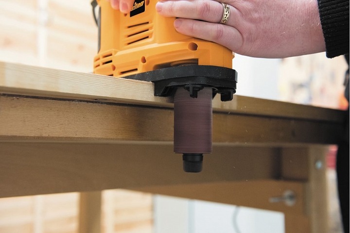 Triton TSPSP650 – уникальный инструмент, работающий по тому же принципу, что и осцилляционно-шпиндельные станки. Его основное назначение – шлифовка криволинейных кромок под прямым углом к плоскости заготовки. За счет осциллирующего движения улучшается качество шлифования (дефекты абразива не оставят продольных полос) и повышается ресурс расходных материалов (втулок). Последние выполнены быстросъемными и фиксируются на шпинделе единственным винтом с головкой под захват рукой. Их меняют не только в случае износа, но и в зависимости от степени кривизны кромки.