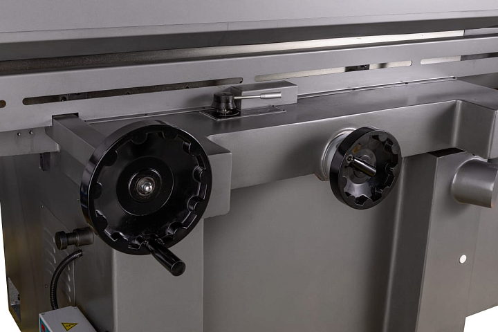 Стол приводится в движение вручную или через гидравлический привод (в правом или левом направлении), скорость плавно изменяется с помощью регулировочного рычага, расположенного на салазках. В поперечном направлении движение стола осуществляется вручную или двигателем через ходовой винт. Шлифовальная голова перемещается с автоматической подачей в диапазоне от 5 до 50мкм с помощью приводного серводвигателя Delta и PLC контроллера фирмы Siemens.