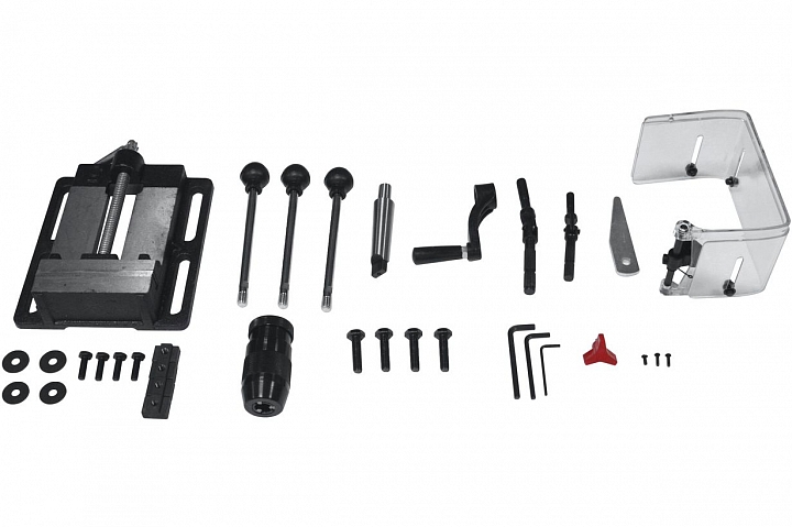 В комплекте поставляется быстрозажимной патрон с оправкой и тиски с монтажными элементами для фиксации в пазах стола или основания.